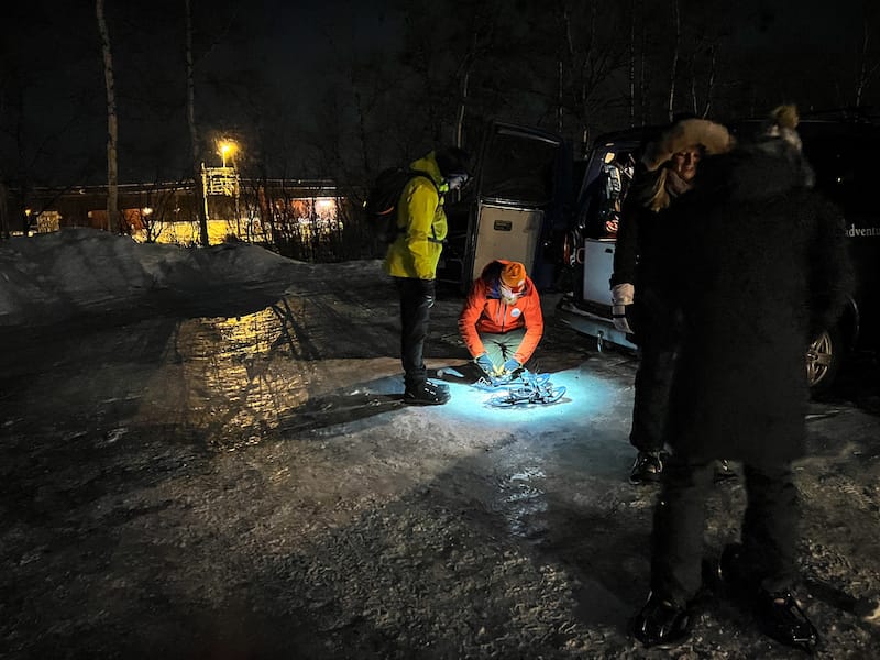 Une fois que tous les membres de la tournée se sont rassemblés, Aril, le guide, nous a équipés de raquettes et nous sommes partis sur notre tournée.